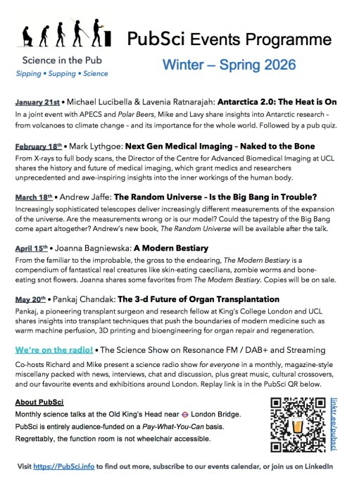 There is no charge for attending PubSci talks, but we have a cash whip-round to cover expenses on the night – consider it “Pay What You Can Afford”. As few of us carry cash these days, you can make a donation when registering for ticketed events with Eventbrite. Please help us continue putting on events. PubSci has no other source of funding.