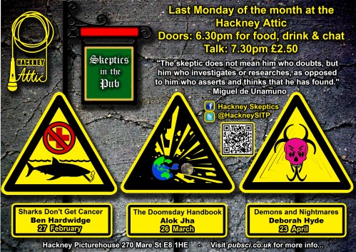 Tonight is the night of Ben Harwidges talk on the “sharks don’t get cancer” myth, it’s the first of a stella line up of talks which will hopefully inform and dispel in equal measure. Worried how the world might end in 2012? Alok Jha will take us through what the real doomsday scenarios are, and as I understand it none involve Justin Beiber (yet). If that doesn’t help you sleep at night, im sure Deborah Hyde’s talk on Demon and Nightmares will rock you calmly off to sleep with out having to check under the bed first.
