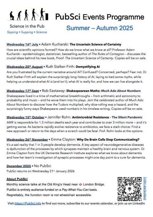 PubSci’s latest programme runs from July to November (there’s no event in December) and is perfect for printing out and pinning to your work noticeboard or sticking to the fridge, It’s always available on the Current Programme page, along with past event programmes, and you can link to the image below on your own website.