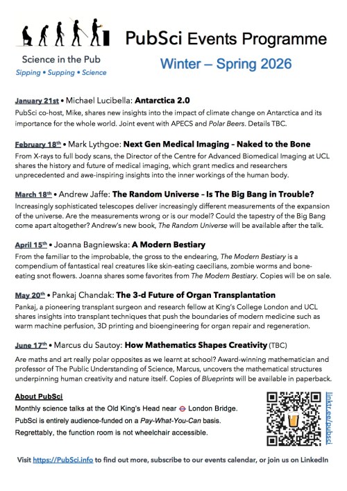 Aaaand finally, PubSci’s new events programme is out, covering January to May 2026 (with a sneak preview of our June talk too) and I’m super-excited with what’s in store for PubSci next year. The events programme is perfect for printing out and pinning to your work noticeboard or sticking to the fridge. It’ll be available on the Current Programme page in a couple of weeks – along with past event programmes – but for now, this is the only place to find it online.