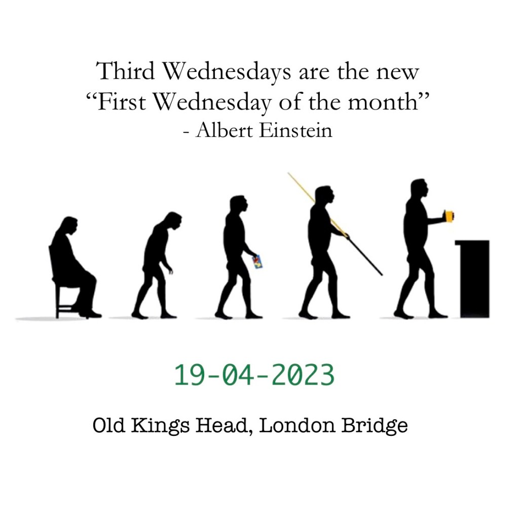 Join us upstairs at the Old King’s Head, near London Bridge station. Doors open at 6.30pm for a 7pm start. The Old King’s Head has a happy hour before 7pm to get you in the mood, and the kitchen serves excellent pub grub.